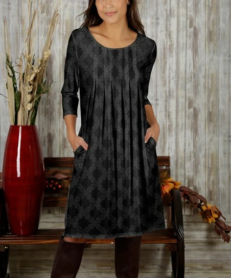 Polished pleats decorate the front of this printed shift dress featuring a round neckline and side pockets.