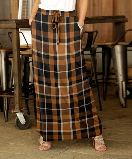 This maxi skirt offers ample coverage with a bold print, a drawstring waistband and pockets.