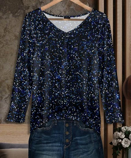 Casual, printed tunic features versatile long-sleeves and a V-neckline.