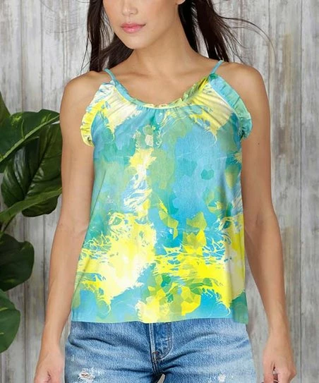 Cami-strap tank with ruffle-accents is an ideal layer under a jacket or can be worn on its own for warmer-temperature days.