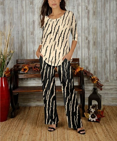 - Includes cream and black slash scoop neck top and black and cream slash pocket pants (two pieces total)