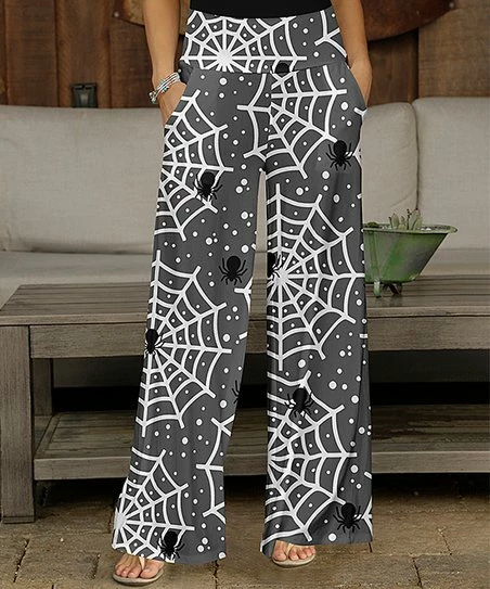 These flowy wide-leg pants feature stretch-infused fabric and a charming spooky pattern.