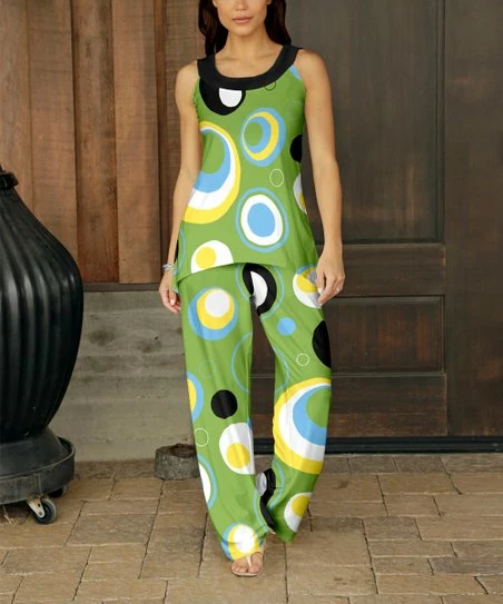 - Includes green and blue abstract circle top and green and blue abstract circle pants (two pieces total)
