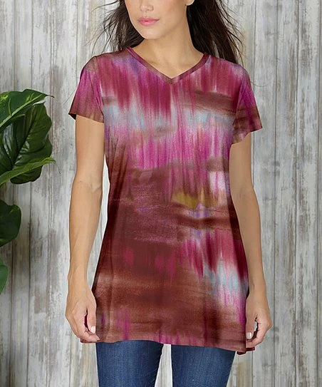 This flowy tunic offers short sleeves and a v-neck for a casual feel.