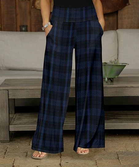 Flowy wide-leg pants featuring stretch-blend material and convenient side pockets.