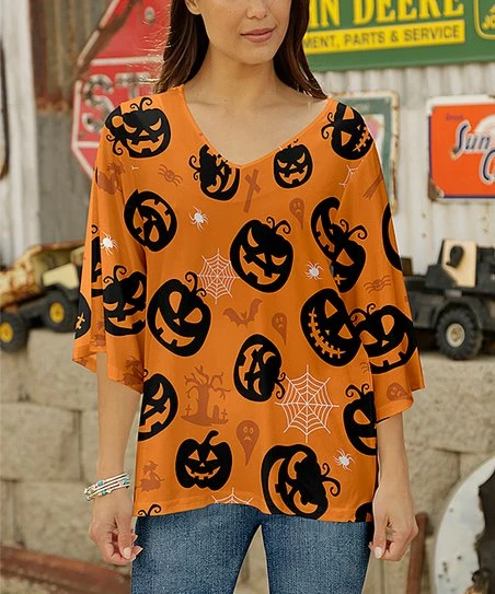 Casual wide-sleeve top with a flattering V-neckline and a playfully spooky pattern.