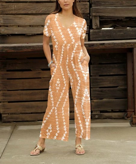 Wide pant-legs, an empire waist and side pockets define this geometric-printed short-sleeve jumpsuit.