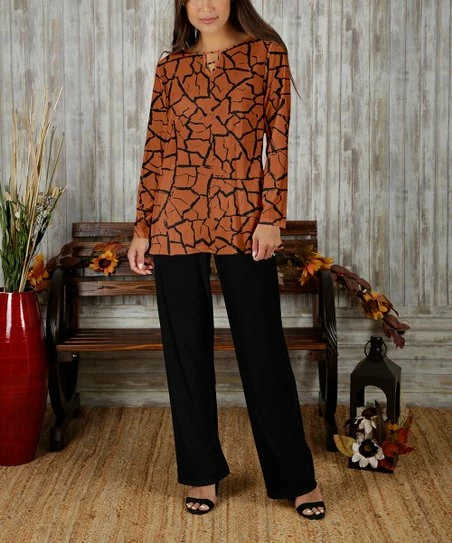 - Includes rust and black crackle long-sleeve tunic and black pants (two pieces total)