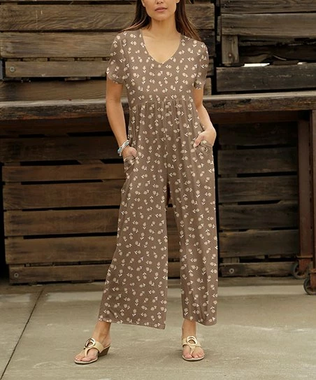 An all-over print elevates this short-sleeve jumpsuit featuring a wide-leg design and flattering empire waist.