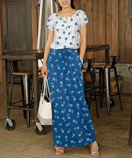 - Includes white floral peasant top and blue floral drawstring pocket maxi skirt (two pieces total)
